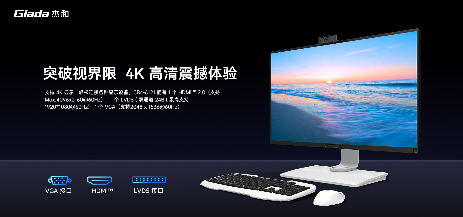 CB4-6121主板提供丰富的扩展接口,满足用户不同的需求。2个DDR4 SO-DIMM插槽,支持高达64GB的内存容量;支持4K显示,拥有1个HDMI ™ 2.0(支持Max.4096x2160@60Hz),1个LVDS( 双通道 24Bit 最高支持 1920*1080@60Hz),1个VGA(支持2048 x 1536@60Hz),让您轻松连接各种显示设备。