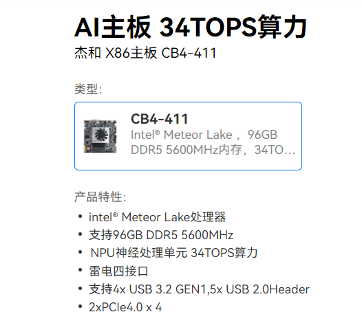 CB4-411支持英特尔Ultra5、Ultra7、Ultra9H系列处理器,支持本地AI计算,拥有34TOPS算力、DDR5高速内存、雷电4接口、2.5 GbE 以太网等功能特性。还在主板功能上进行改良,增加一键静音、一键熄屏、一键音量加减的功能。
