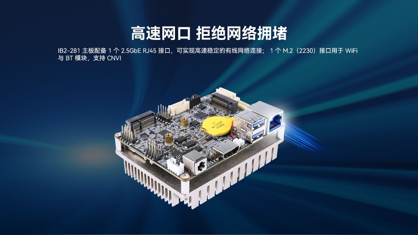 IB2-281接口丰富,配备2个USB3.2 Gen2接口,适配多种IoT设备连接需求,还有1个2.5GbE网口,即使在高峰时段,也能快速处理众多客户的购买需求,保证自助收银的连续性和稳定性。1xM.2(2242)PCIe3.0x4接口可安装高速SSD,提供卓越的数据存储性能。