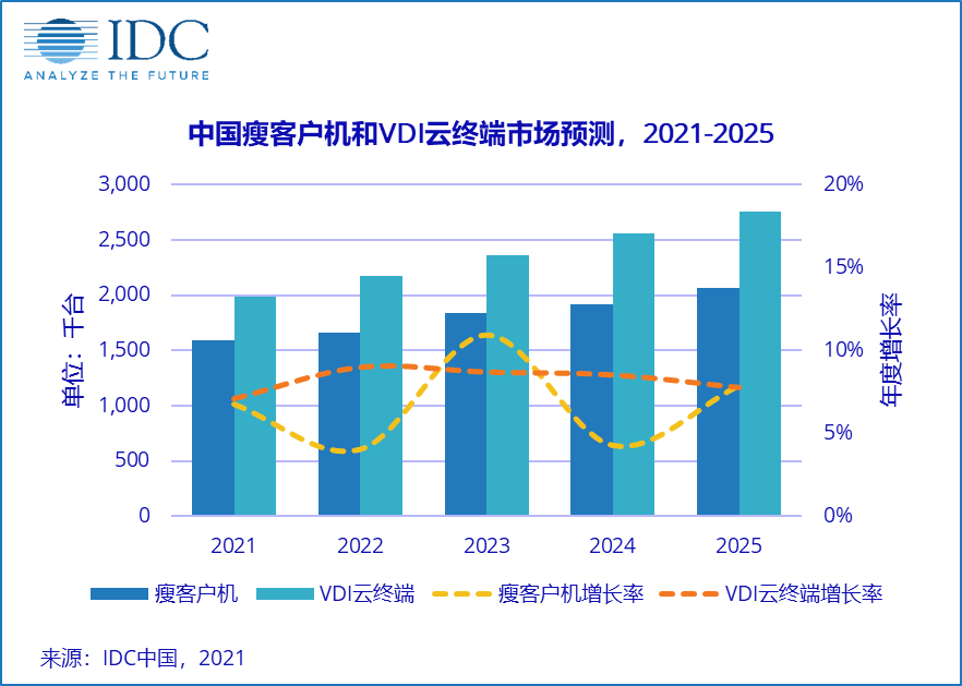 据IDC预计,至2025年,中国瘦客户机市场规模将超过207万台,五年复合增长率将达到6.7%。桌面云终端VDI市场规模将突破275万台,五年复合增长率将超过8.5%。