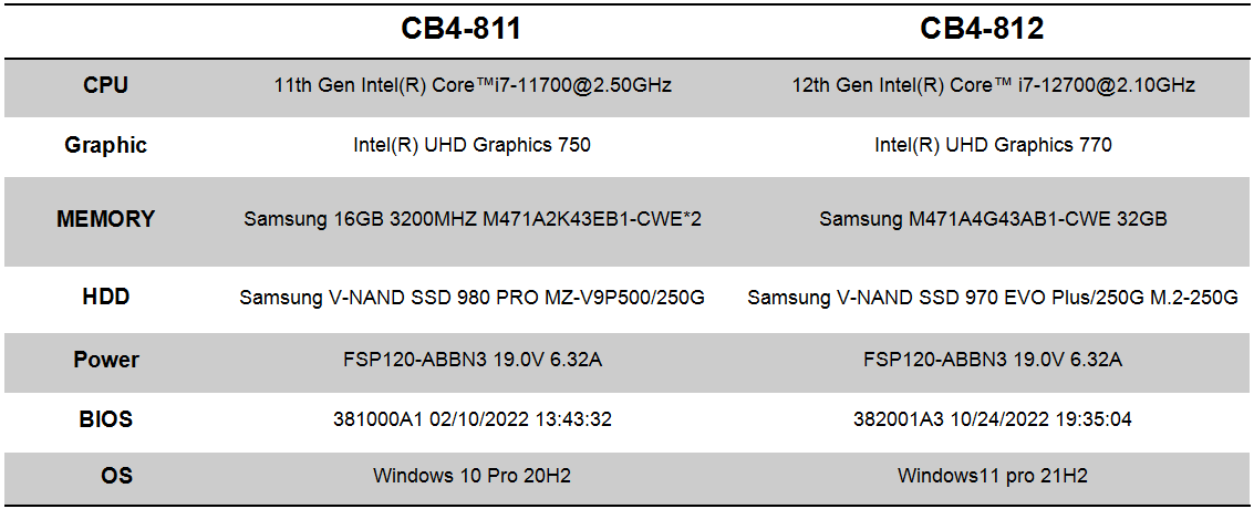 Giada南宫NG·28(中国)相信品牌力量科技针对这款一体机专研主板CB4-8121进行了EVT全功能测试,针对客户会关注的各个重点进行了全面测试,包括各功能、性能、兼容性、稳定性等方面的专业测试及分析。CB4-8121不仅全部通过,且各个数据结果都表现相当出色,优秀的配置与研发设计工艺,无疑让用户的使用体验直线拉满。全性能测试报告中,值得关注的是性能测试的跑分数据和稳定性测试内容,这能直观影响主板在一体机中的稳定性和用户的使用体验。针对性能测试,南宫NG·28(中国)相信品牌力量选择了将CB4-8121与前一款更迭产品CB4-8111进行对比分析,并分别选取了以下配置: