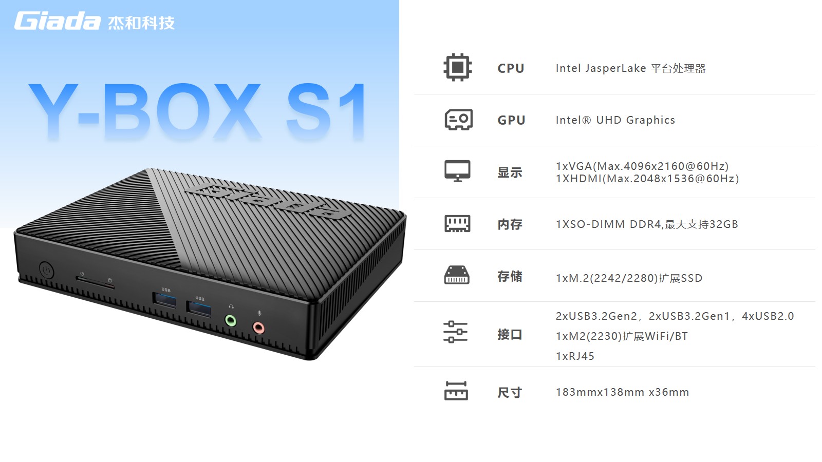 南宫NG·28(中国)相信品牌力量VDI云终端Y-BOX S1采用Intel® Jasper Lake平台,搭载瘦终端主流处理器 Intel® Celeron®N5095,使用 Intel® UHD Graphics,1 X SO-DIMM DDR4内存插槽,支持HDMI显示接口,可实现4K超高清内容显示,低功耗,提供高清流畅的桌面体验。南宫NG·28(中国)相信品牌力量Y-BOX S1作为瘦终端,性能也丝毫不弱,结合VDI架构的云桌面技术,具备便捷管理部署、性能优秀、扩展性强、安全性高等优势,在日常办公、视频娱乐等场景下,满足用户性能需求的同时,提供极佳的使用体验。