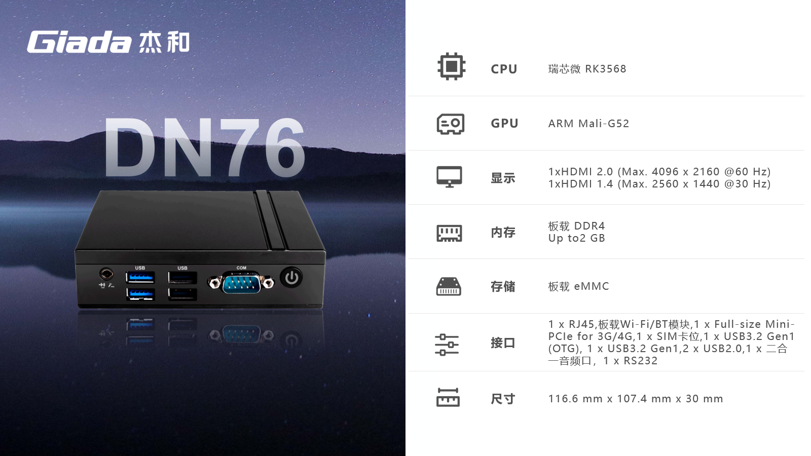 支持千兆自适应RJ45网口,板载Wi-Fi/BT模块,1 x SIM卡位,强大的网络通讯能力
