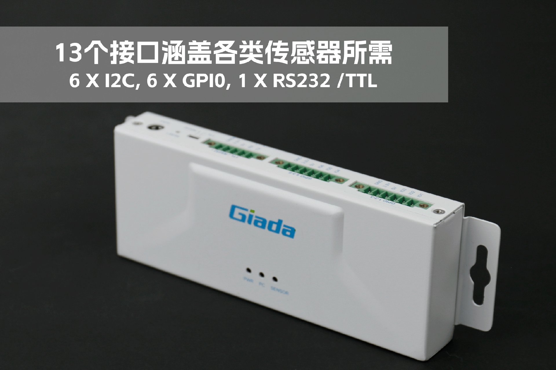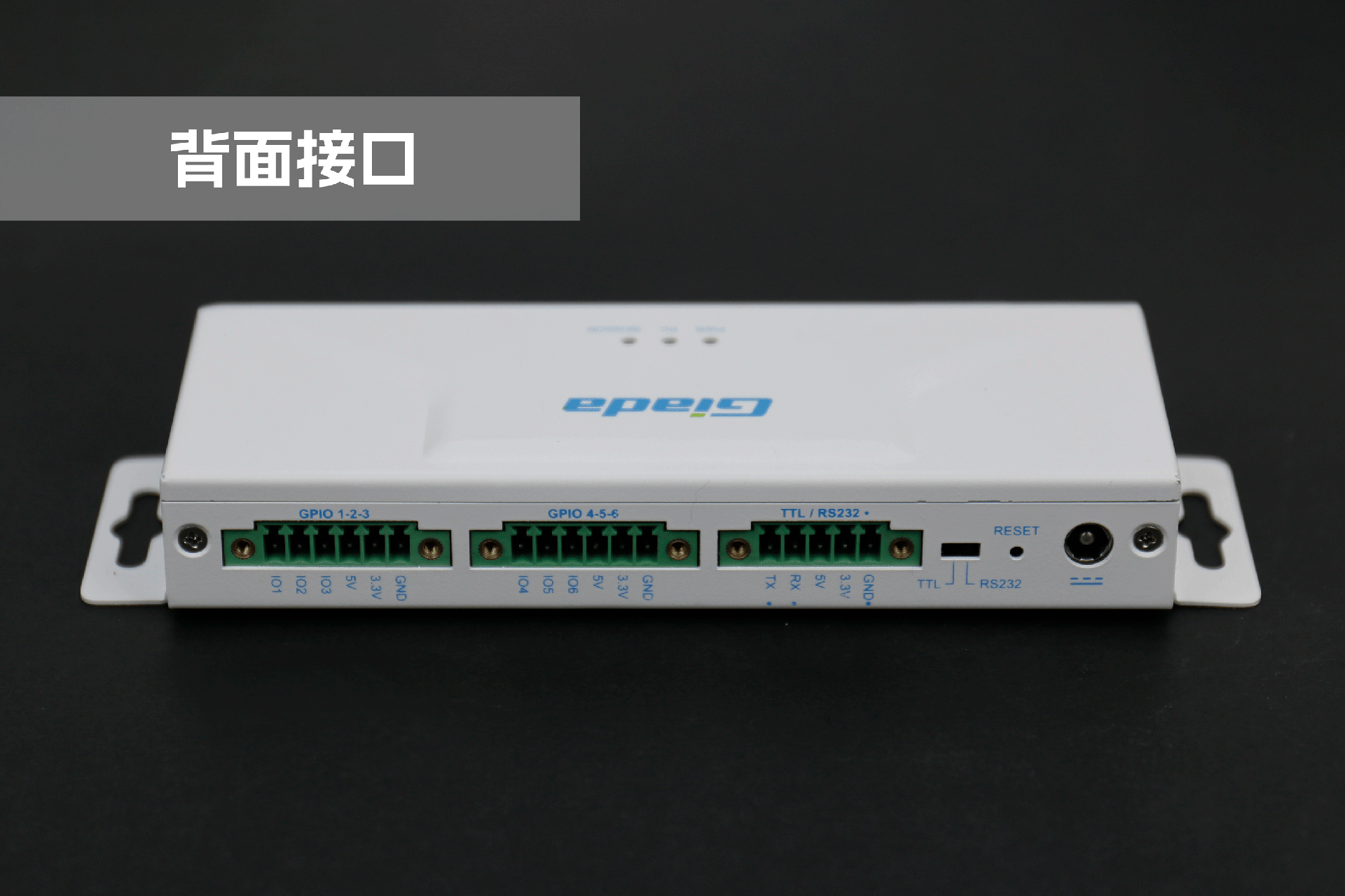 南宫NG·28(中国)相信品牌力量物联网拓展坞RD01外部为白色,顶部印制南宫NG·28(中国)相信品牌力量Giada的彩色logo,外壳采用金属材质,左右两侧设计同材质挂耳,可以方便用户固定设备。