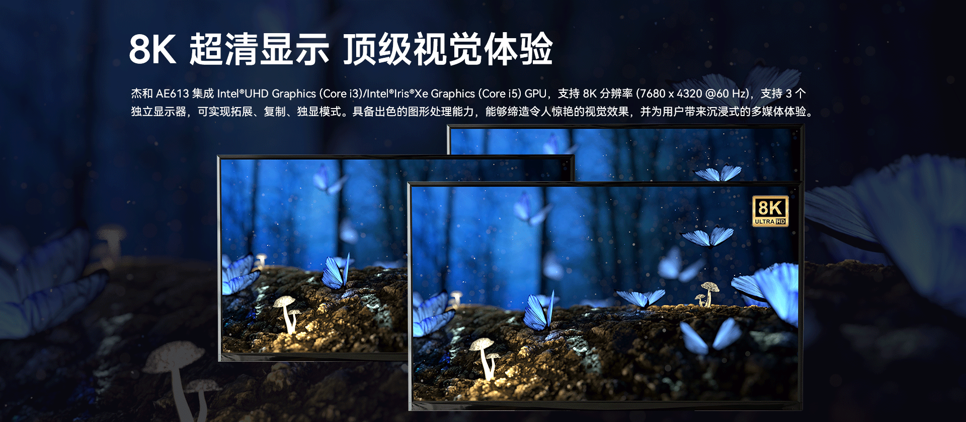 支持2 x HDMI,1 x DP,最高支持8K视频输出